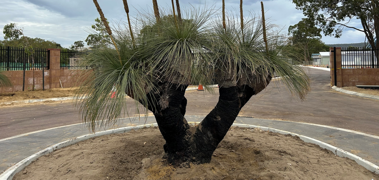 Standing at the entrance to our new community at the centre of a carefully crafted roundabout, framed by the wide WA sky and the beginnings of our Stage 1 landscaping, is an ancient Grasstree. Its charred black trunk branches into two. Its grassy crown fans outward in every direction. And its tall, slender flower spikes reach upward with a kind of quiet authority that no planted shrub or decorative feature could ever replicate.