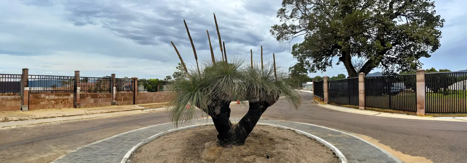 Standing at the entrance to our new community at the centre of a carefully crafted roundabout, framed by the wide WA sky and the beginnings of our Stage 1 landscaping, is an ancient Grasstree. Its charred black trunk branches into two. Its grassy crown fans outward in every direction. And its tall, slender flower spikes reach upward with a kind of quiet authority that no planted shrub or decorative feature could ever replicate.