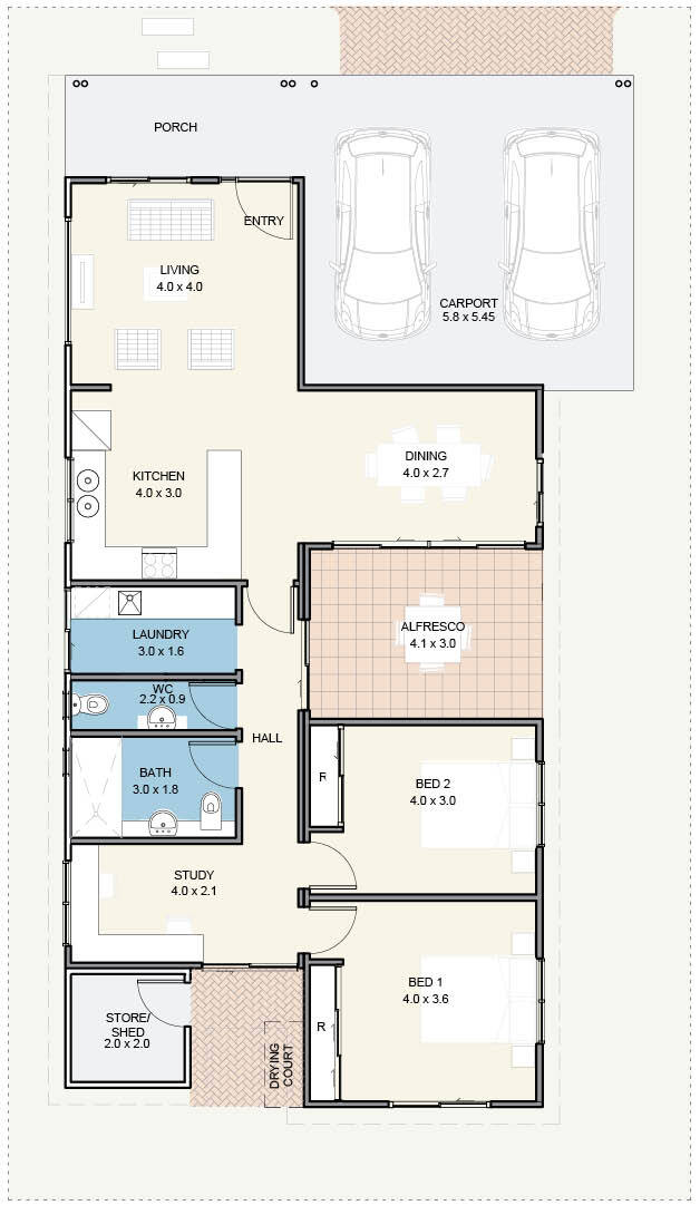 Two spacious bedrooms, adjacent to the bathroom and located at the rear of the home provide peaceful privacy away from the living/entertaining zone at the front. Access to the alfresco is directly off the dining area or from the hallway, off which the roomy laundry and bathroom are located.