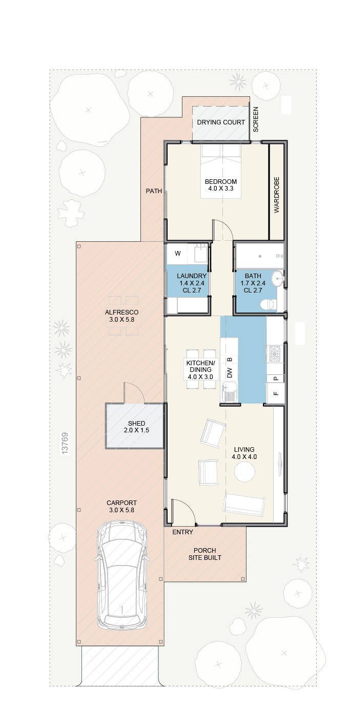 A compact yet highly functional 1 bedroom 1 bathroom home that has the bedroom and living area situated at opposite ends. Access to the alfresco is directly from the kitchen/dining area to make entertaining a breeze. The clever design also incorporates a separate bathroom and laundry.